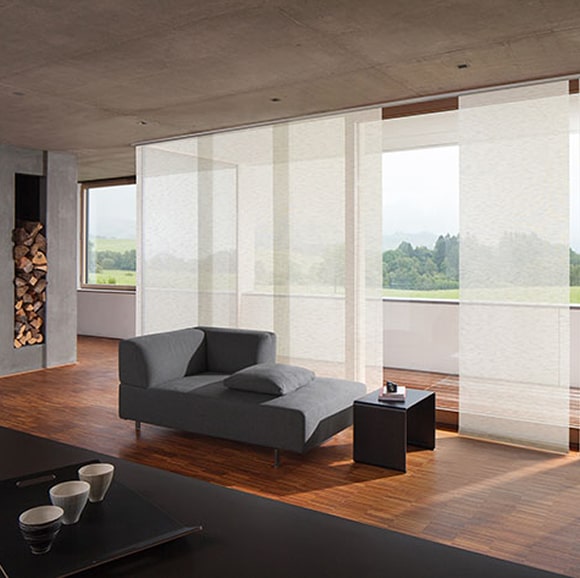 Verschiebbare Paneele, natürlich auf Maß gefertigt, setzen klare Statements und lassen sich sowohl manuell als auch elektrisch komfortabel bedienen. Und auch hier kann mit Farbe und Dessin so richtig „gespielt" werden.